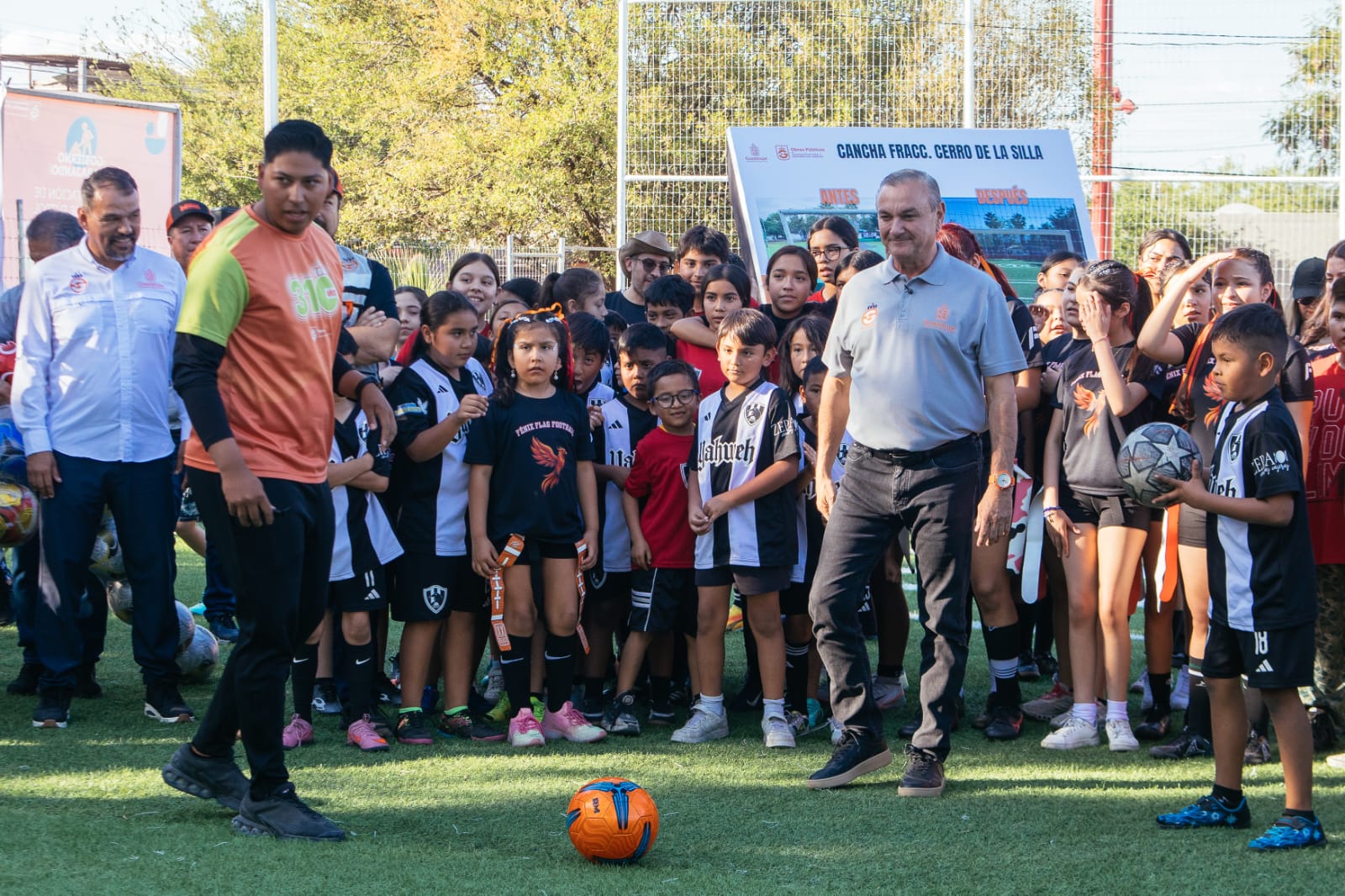 Se especificó que en la colonia Cerro de la Silla se llevó a cabo la instalación de una cancha de pasto sintético con una superficie de 600 metros cuadrados, además de que en el sitio se rehabilitó una vitapista de 734 metros lineales, se colocó malla perimetral y se mejoró las condiciones de mobiliario urbano y luminarias en la zona.